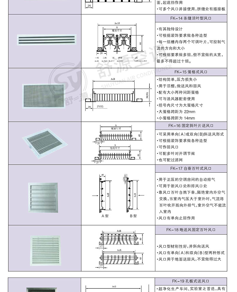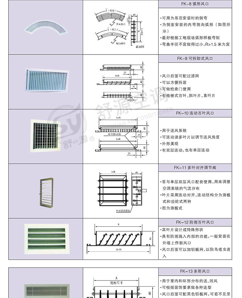 江苏舒源空调制造有限公司生产“舒源”牌组合式空调机组、柜式空调机组、风机盘管和各种规格通风配件、自动控制柜、空气净化及防火阀消声类产品,亦承接空调通风工程、净化工程的设计、制作安装业务,并可根据用户需要设计制造非标产品。