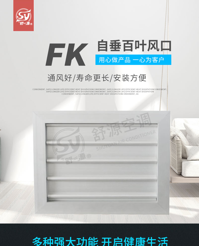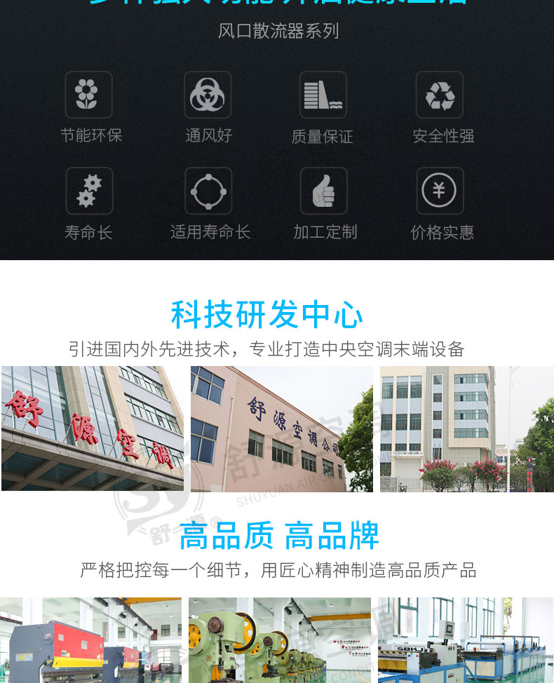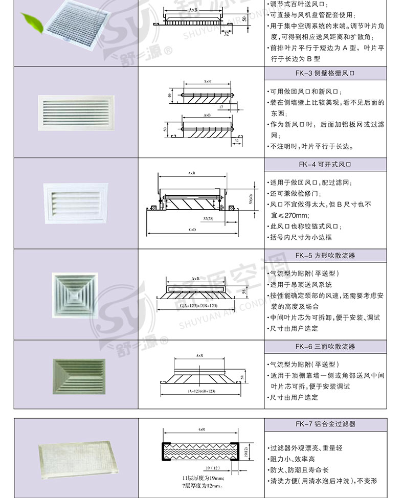 江苏舒源空调制造有限公司生产“舒源”牌组合式空调机组、柜式空调机组、风机盘管和各种规格通风配件、自动控制柜、空气净化及防火阀消声类产品,亦承接空调通风工程、净化工程的设计、制作安装业务,并可根据用户需要设计制造非标产品。