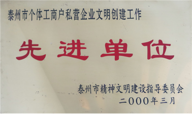 2000年泰州市精神文明建设指导委员会授予舒源空调(http://www.js-sykt.com/)“先进单位”荣誉称号