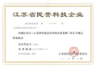 2016年江苏省民营科技企业协会授予舒源空调(http://www.js-sykt.com/)“名营科技企业证书”荣誉称号