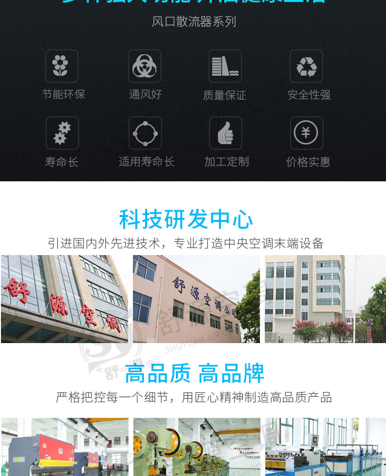 江苏舒源空调制造有限公司生产“舒源”牌组合式空调机组、柜式空调机组、风机盘管和各种规格通风配件、自动控制柜、空气净化及防火阀消声类产品,亦承接空调通风工程、净化工程的设计、制作安装业务,并可根据用户需要设计制造非标产品。
