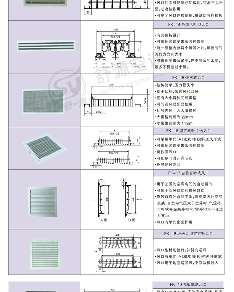 江苏舒源空调制造有限公司生产“舒源”牌组合式空调机组、柜式空调机组、风机盘管和各种规格通风配件、自动控制柜、空气净化及防火阀消声类产品,亦承接空调通风工程、净化工程的设计、制作安装业务,并可根据用户需要设计制造非标产品。