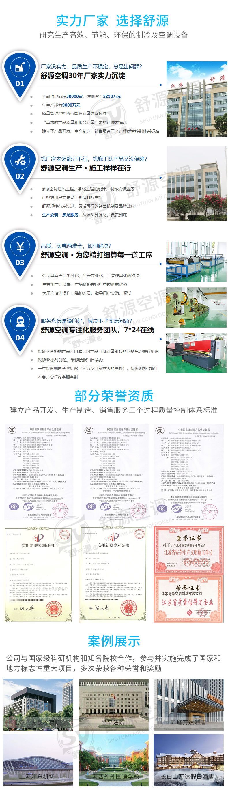 江苏舒源空调制造有限公司生产“舒源”牌组合式空调机组、柜式空调机组、风机盘管和各种规格通风配件、自动控制柜、空气净化及防火阀消声类产品,亦承接空调通风工程、净化工程的设计、制作安装业务,并可根据用户需要设计制造非标产品。